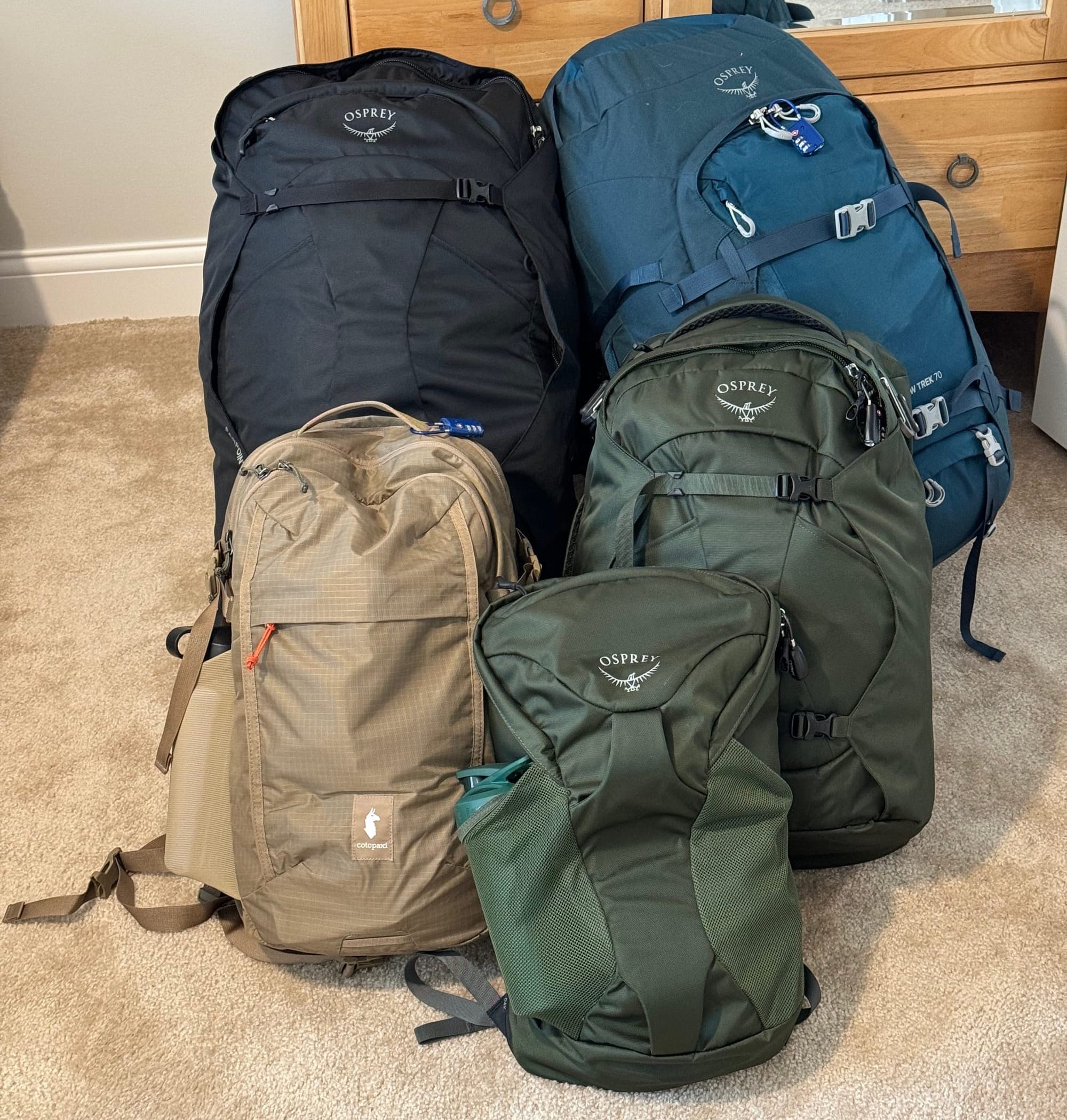 - Tyler: 80L Osprey Farpoint backpack, 40L Osprey Farpoint backpack, 15L Osprey daypack