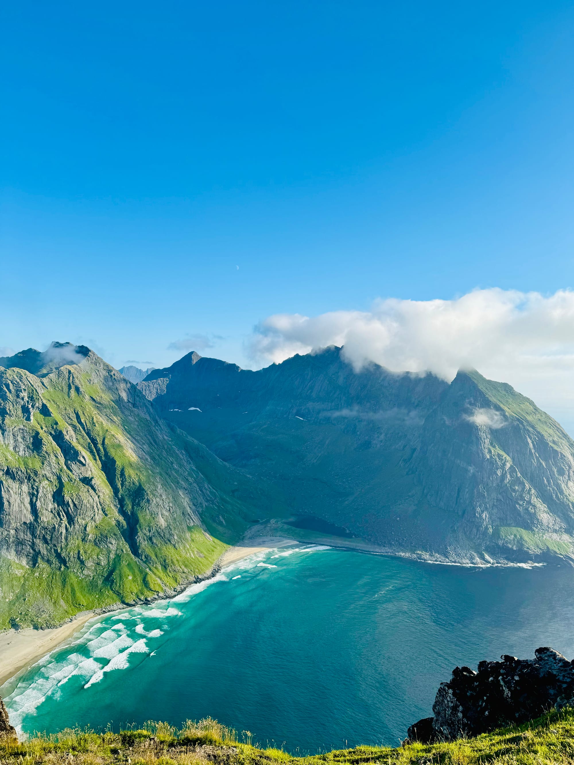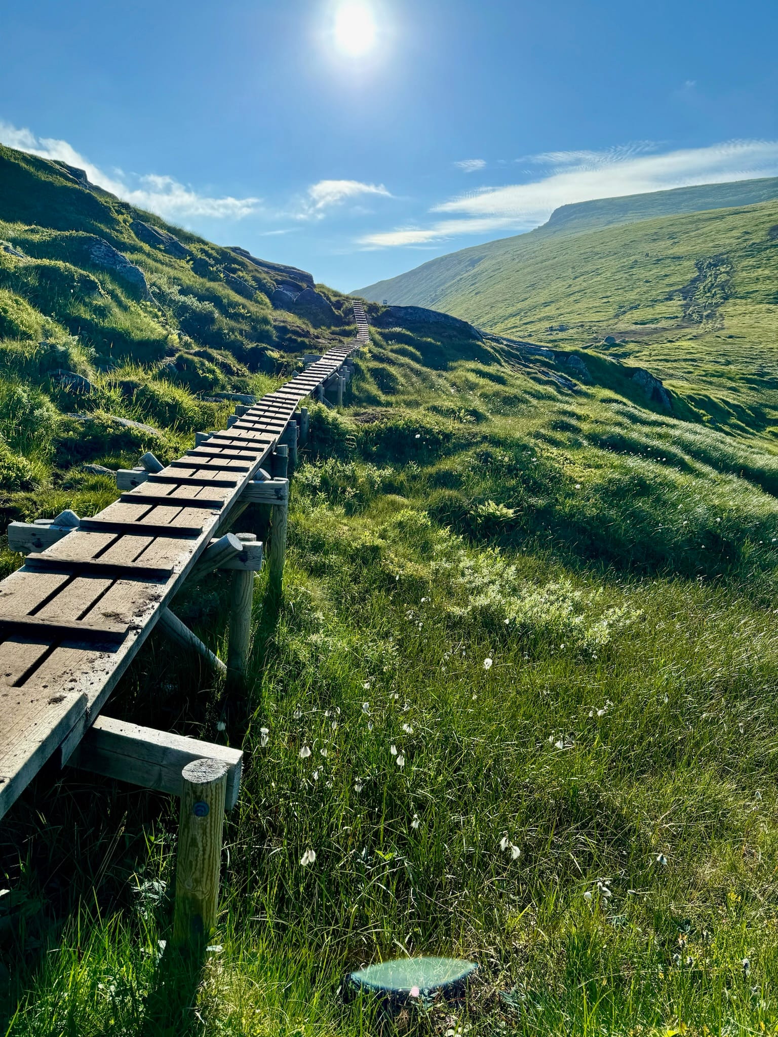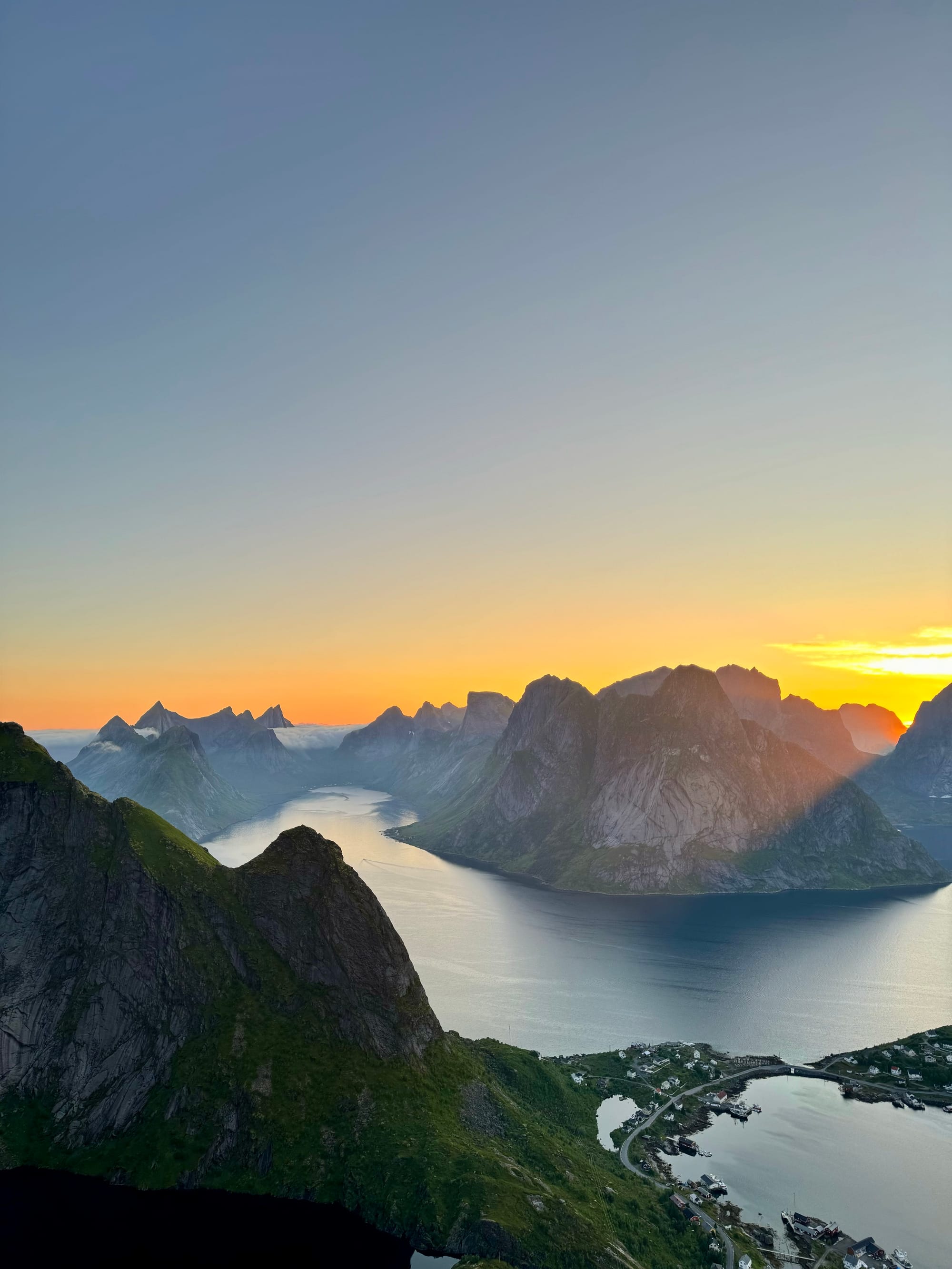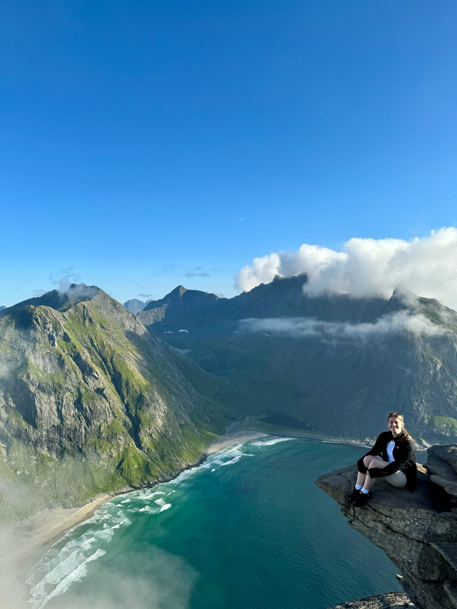 While we felt invincible, the midnight hikes did eventually catch up to us and the ~3-4 hours of sleep wasn't cutting it. Our last 24 hours in Reine teased us with pristine conditions, so we went all in on maximizing our time outside. While Lofoten is beautiful, it’s still frequently rainy in the summer, and cloud coverage can sneak in for days at a time. To take advantage of the fully unobstructed sun after a full day of exploring the town, we hiked Ryten, a cliffside hike with views of pastures on one side and an Arctic beach on the other, from 6 pm - 10 pm. We drove back to our hotel to refill our water, have a pastry (read: 4 pastries), and then turned around to hike Reinebringen from midnight to 4:30 am. There was no stopping at that point; we showered, packed, and then proceeded directly to our 7 am ferry ride back to Bodø.