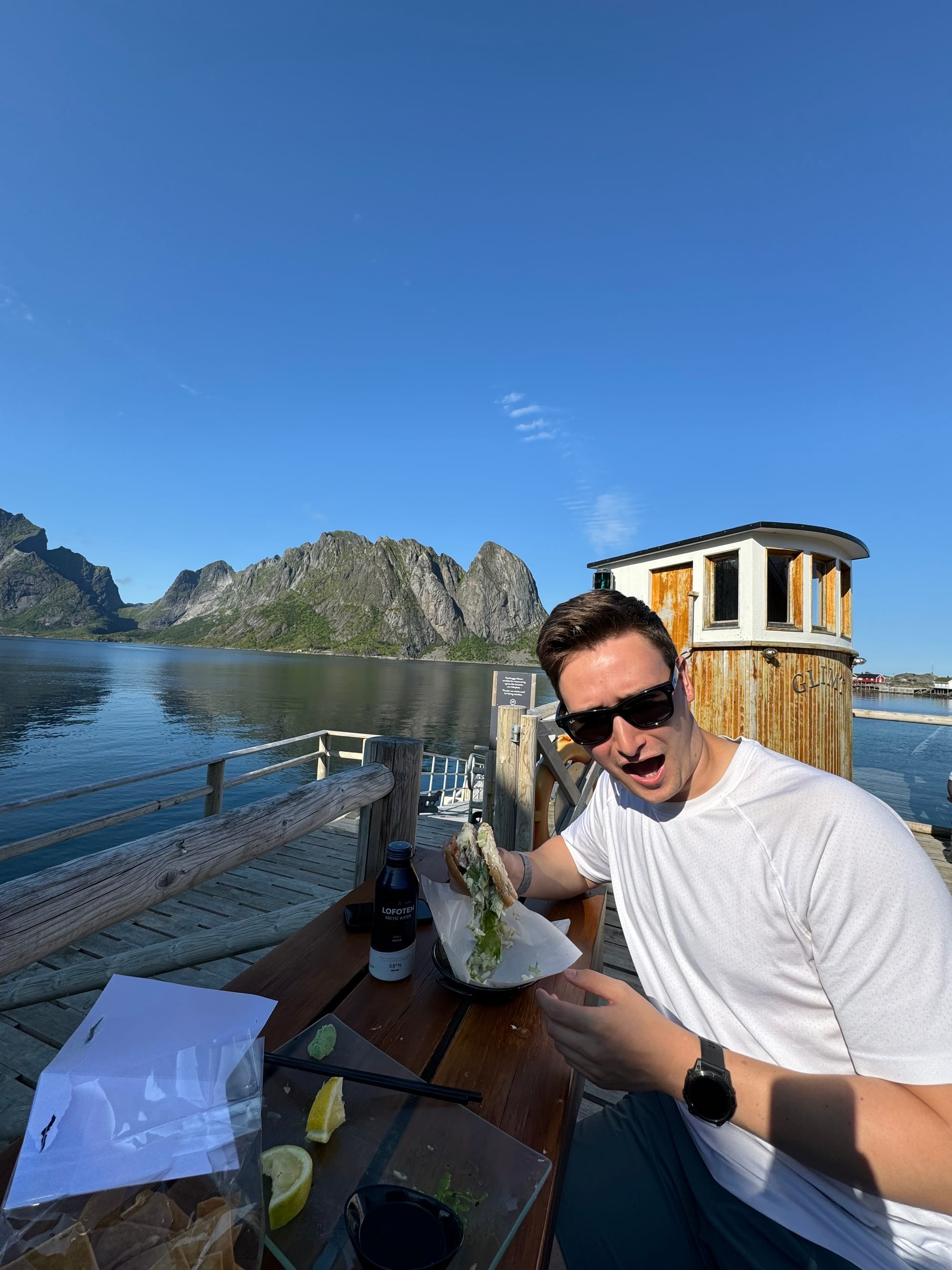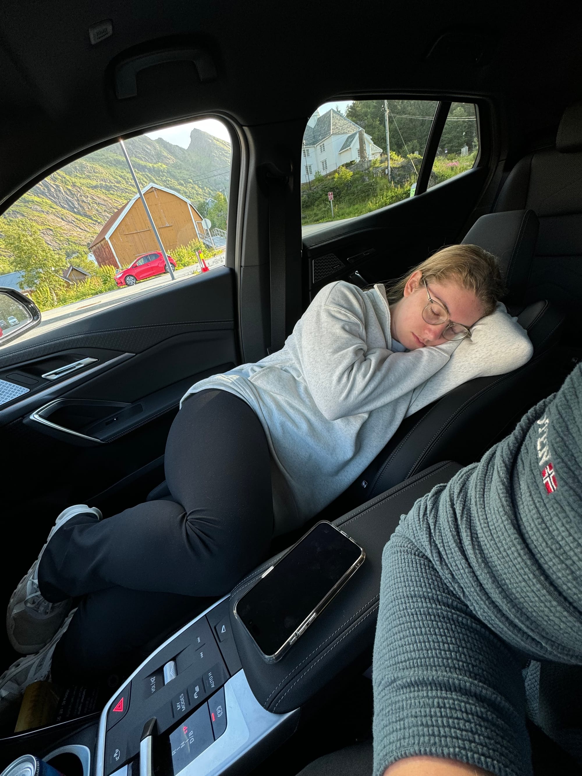 Once on the ferry, hoodies were up and AirPods were in. It took Tyler less than 90 seconds to fall straight to sleep for the entirety of the 4-hour ferry. As drowsy-eyed as we were, we managed to get in the car, find a free parking spot in town, and sleep another 4 hours in the rental car before grabbing a burger and heading to the airport for our flight to Trondheim. Needless to say, we are not invincible and the human body does require sleep even with the magic of 24 hours of natural light.