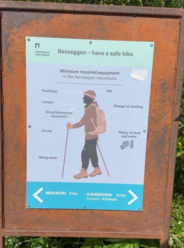 We were feeling confident after our Bakkanossi hike, so we decided to tackle the Besseggen hike. Based on our research, Bessenggen and Jotunheimen go hand-in-hand. While we read about all the logistics of the 9-mile hike and the ferry required to get to the starting point, we let all knowledge of preparedness flee after we saw the weather looked clear and comfortable (i.e., we’ll be fine). We showed up late on the morning of the hike almost missing our scheduled ferry, with a single backpack carrying 2 liters of water, 2 protein bars, and a windbreaker for each of us. Just take a moment to look at the sign at the trailhead.