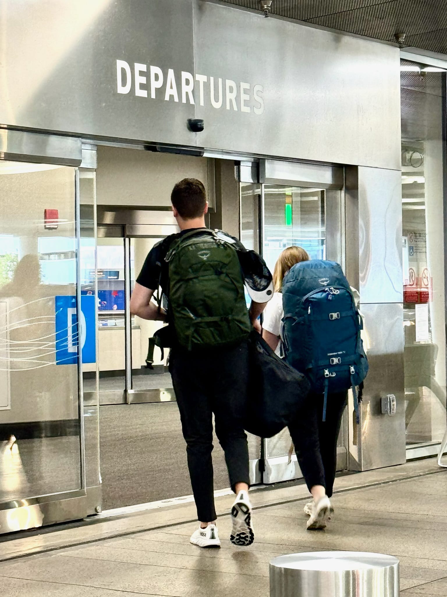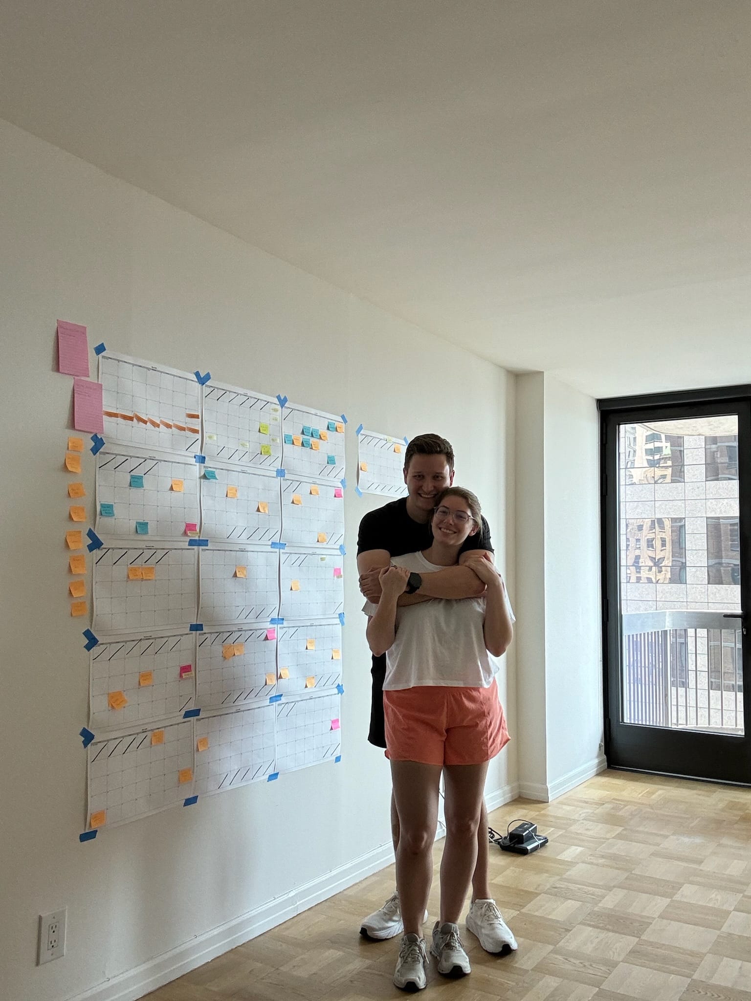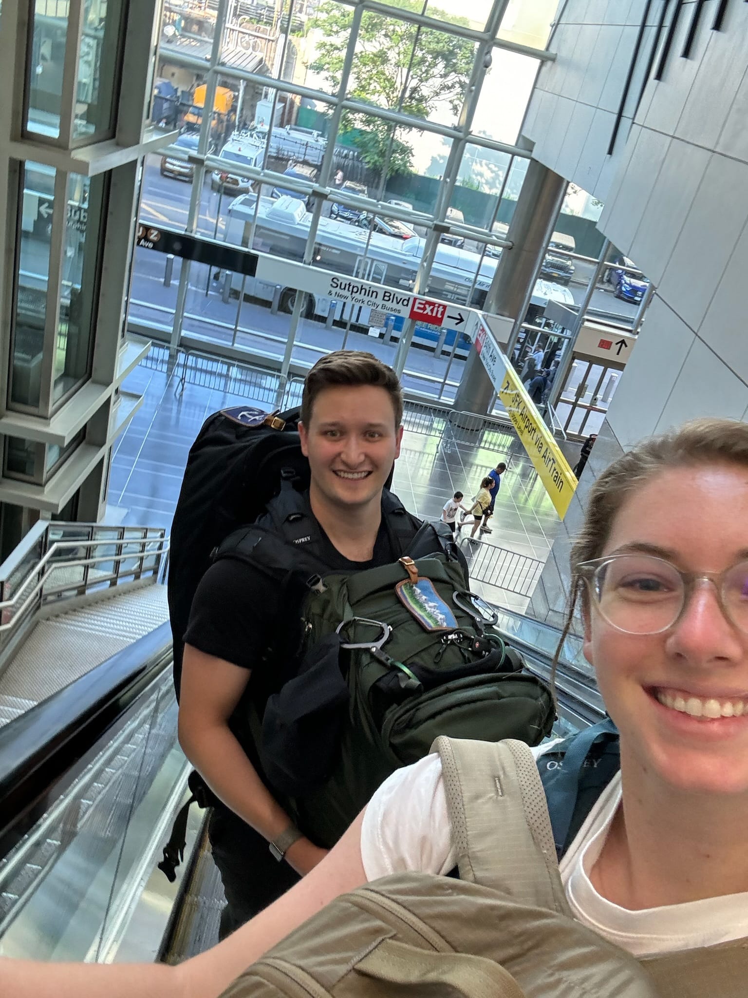 Go to all the doctor appointments before we lost (USA) health insurance, pack up the apartment, find a place to stay in Amsterdam, book Airbnbs in Norway, book car rental, drive a U-Haul through Manhattan, plan a bachelor party, go to a bachelor party, say hi and goodbye to the family... the list of to-dos was greater than the hours we had. Between teeth cleanings and consultations with travel doctors to get a concoction of shots to help us out along our journeys, it was time to pack our apartment and move out.Driving a U-Haul through Manhattan is no joke, especially on a weekday morning through Midtown. Luckily, Makenna didn't have to do any of it :)We had talked about would be great to pack and certainly did our fair share of online shopping, however Makenna only opened her 70 L backpack for the first time while she was in Ohio and Tyler packed from the hours of 10 am - 2 am the night before our flight. We aren't joking when we say we were a bit of a mess. Don't let the smiles fool you, our stuff was everywhere and the bags were loosely packed for our first dry run and the photo op.When it came time for our first official flight, we slept through our morning alarm so it was a quick goodbye before we were off!There was a steep learning to curve to suddenly carrying 40+ lbs on your back and 20+ lbs on the front. "This bag is making me winded, I'm going to sit down" - MakennaAll this to say, a lot has changed between when we first picked up our keys in September 2021......And when we returned our keys in July 2024. One final photo memorializing the paper calendar we used to plan, but mostly just stared at, for 3 months prior to resigning from our jobs. So here we are, under planned, tired, but more importantly, excited for what's next!